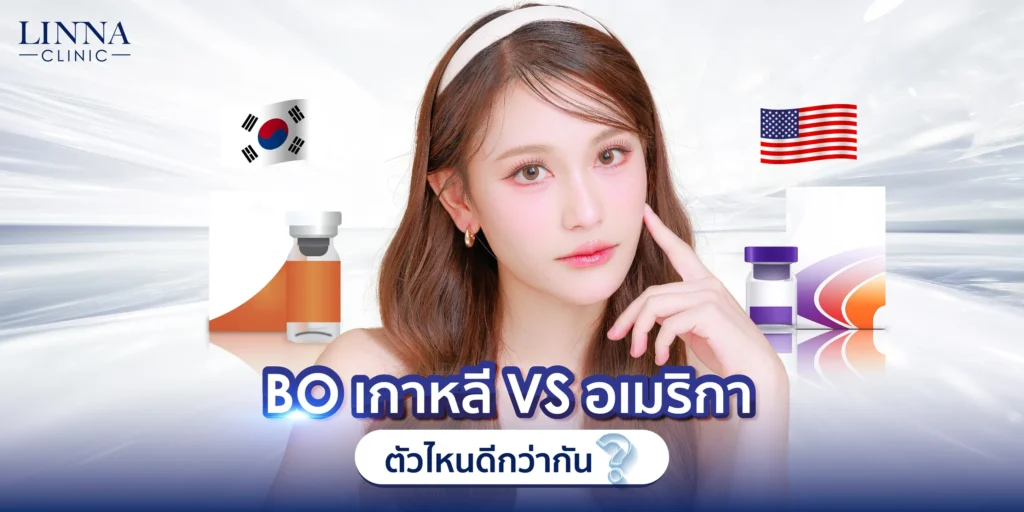 การฉีดโบ ในปัจจุบันคลินิกส่วนใหญ่จะมีโบ หลายยี่ห้อให้คนไข้เลือก ซึ่งโบเกาหลีและอเมริกาเป็นแบรนด์ได้รับความนิยมมากค่ะ สำหรับใครที่กำลังหาข้อมูลการฉีดโบ  หมอจะอธิบายว่าโบ เกาหลีอเมริกาคืออะไร มีข้อดีข้อเสียต่างกันอย่างไร เพื่อเป็นข้อมูลประกอบการตัดสินใจค่ะ Table of Contents โบ เกาหลี คืออะไร โบ เกาหลี คือ โบที่ผลิตและนำเข้ามาจากสาธารณรัฐเกาหลีหรือประเทศเกาหลีใต้ เริ่มใช้กันมาเกือบ 10 ปี ได้รับความนิยมอย่างรวดเร็วในประเทศไทย ทั้งนี้อาจเป็นเพราะกระแสความนิยมของนักแสดงและนักร้องเกาหลีที่โด่งดังในเมืองไทย เลยทำให้หลายคนเริ่มอยากมีใบหน้าเรียวเหมือนคนเกาหลี เมื่อโบ เกาหลีเข้ามาประเทศไทย ทุกคนจึงมีความนิยมฉีดของเกาหลี เพราะหวังว่าจะได้หน้าเรียวสวยแบบไอดอลเกาหลี และโบ เกาหลีค่อนข้างได้รับความนิยมด้วยราคาที่ถูกกว่ามาก ปัจจุบันมีหลายยี่ห้อที่ผ่านการรับรองจากอย. เช่นยี่ห้อ Botulax และ Nabota ความบริสุทธิ์เฉลี่ยอยู่ที่ประมาณ 98.7%  โบ เกาหลีกับอเมริกาตัวไหนดีกว่ากัน ข้อดี: ราคาที่ไม่แพงมากเมื่อเทียบกับโบ อเมริกา จากประสบการณ์ของหมอในการใช้โบ เกาหลีพบว่ามีการออกฤทธิ์ไวกว่าเล็กน้อยค่ะ ข้อเสีย: โบเกาหลีมีระยะเวลาออกฤทธิ์สั้นกว่าโบอเมริกา เฉลี่ยอยู่ที่ 4-6 เดือน ขึ้นอยู่กับผิว วิธีการดูแลและการใช้ชีวิตประจำวันของแต่ละบุคคลด้วยค่ะ โบอเมริกา คืออะไร โบอเมริกา คือ โบที่ผลิตและนำเข้ามาจากประเทศสหรัฐอเมริกา ยี่ห้อที่มีชื่อเสียง เช่น Allergan Botox