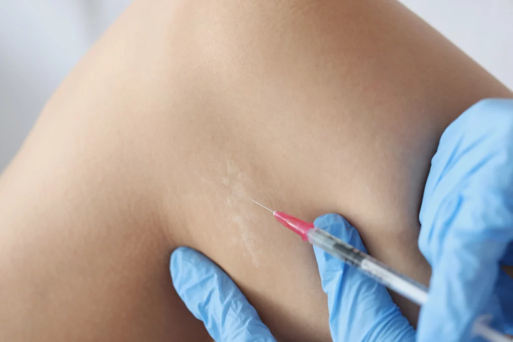 A targeted injection treatment for keloid and raised scars, designed to reduce thickness, firmness, and visibility while improving overall skin appearance.
