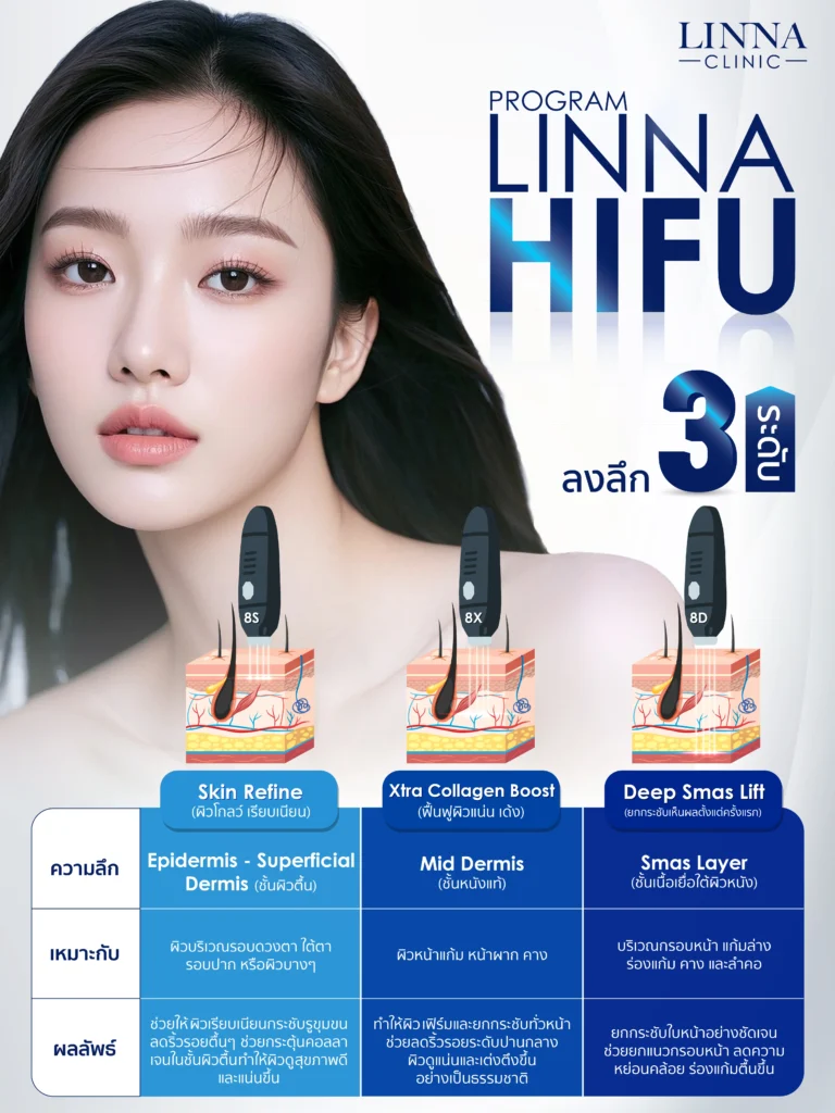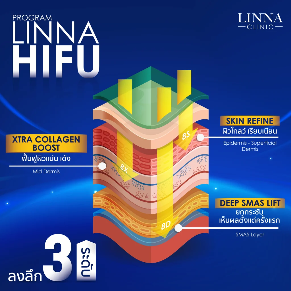 HIFU ย่อมาจาก High Intensity Focus Ultrasound คือการนำคลื่น Ultrasound ซึ่งเป็นคลื่นที่ปลอดภัยสูง นำมาใช้ในการยกกระชับใบหน้า โดยพลังงานที่ยิงจะลงลึกถึงโครงสร้างเนื้อเยื่อชั้นในที่ยึดมีหน้าที่โครงสร้างใบหน้า (SMAS) คลื่น ultrasound จะลงไปก่อให้เกิดแผลที่ชั้นเนื้อเยื่อในชั้นผิวหนังระดับลึกถึงชั้น SMAS ซึ่งเป็นชั้นเดียวที่หมอศัลยกรรมผ่าตัดดึงหน้า ทำให้SMASเกิดแผลและเกิดการหดตัว คล้ายกับการทำศัลยกรรมดึงหน้า โดยที่ผิวหนังชั้นบนไม่มีแผลหรือร่องรอยใดๆ นอกจากการยกกระชับแล้ว HIFUที่ลินนาคลินิก ยังช่วยกระตุ้นคอลลาเจนในชั้นผิวได้ดีกว่าเครื่องทั่วไปในท้องตลาดอีกด้วย ที่ลินนาคลินิกคุณหมอทำเองทุกเคสนะคะ มั่นใจถึงความปลอดภัยได้เลยค่า