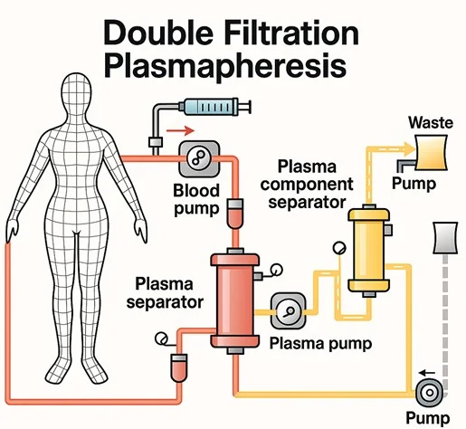 而 DFPP(Double Filtration Plasmapheresis,双重过滤血浆分离术) 是一种进行两阶段血浆过滤的方式。第一阶段将血浆与血细胞分离,随后将获得的血浆再通过具有特异性的第二层过滤器,仅去除不需要的分子,并将经过过滤的血浆回输至体内。