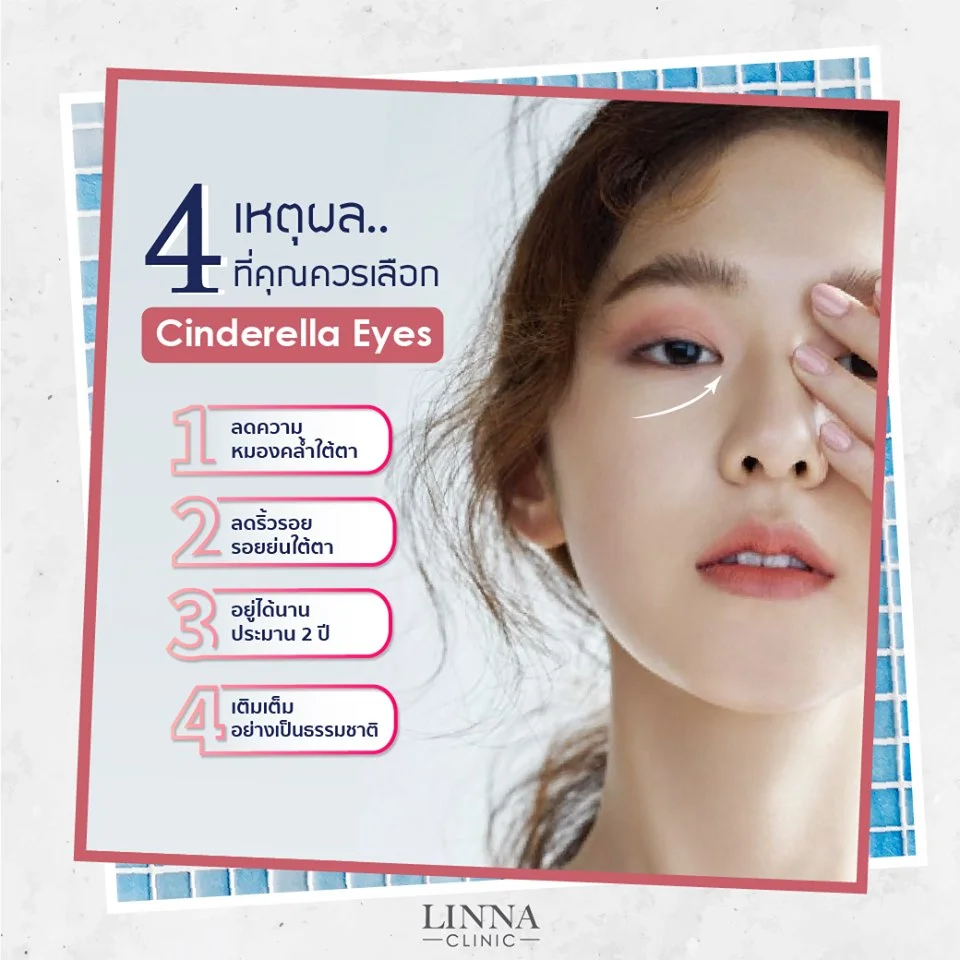 - ร่องน้ำตา – เกิดจากชั้นไขมันรอบดวงตาหดตัวลง ทำให้เกิดร่องลึกใต้ดวงตา เรียกว่าร่องน้ำตา โดยปกติร่องนี้สามารถแก้ไขเบื้องต้นโดยการใช้ฟิลเลอร์ แต่หากมีความรุนแรงมาก หรือเป็นร่องจากการที่ผิวขาดความกระชับ จำเป็นต้องทำ Cinderella Eyes ควบคู่กันไป